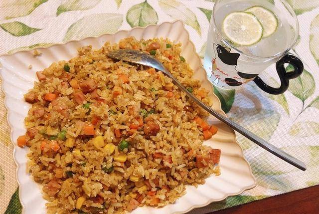 5、炒米饭:将准备好的米饭放入锅中,加入适量的油,小火翻炒,待米饭炒热后,加入炒好的鸡蛋、蔬菜、火腿,继续翻炒。