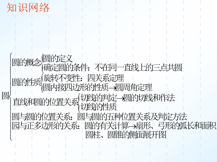1、圆的基本性质:包括圆的定义、圆心角定理、垂径定理等。