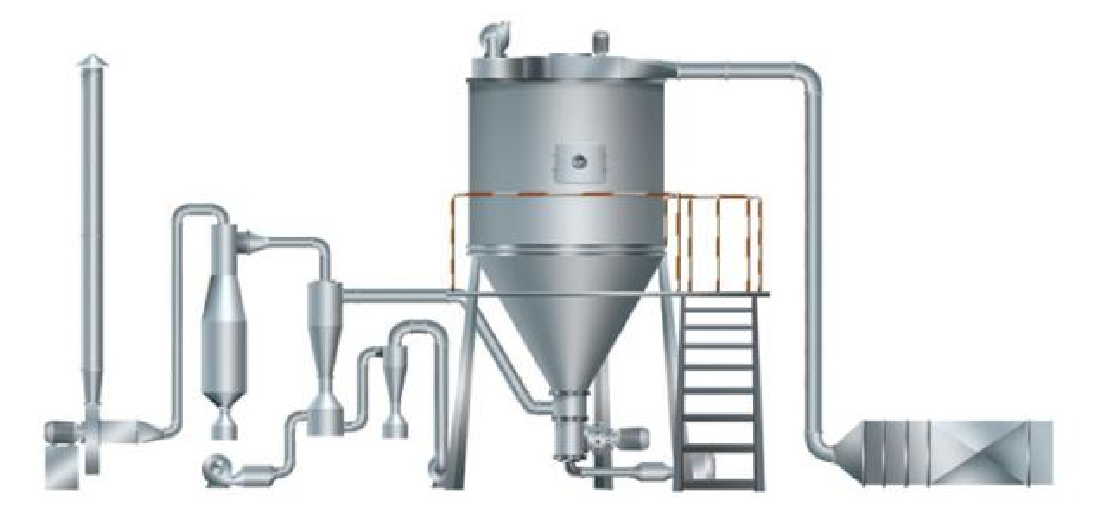 板式换热器由一系列金属板片组成,板片间形成薄矩形通道,喷雾干燥过程中的热交换就在这里进行,板式换热器具有结构紧凑、拆卸方便、传热效率高等优点,适用于高温、高粘度的物料喷雾干燥。