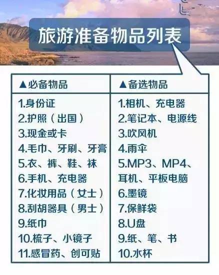 根据目的地和行程安排,准备合适的装备,户外徒步需要专业的户外装备,城市旅行则更注重轻便和时尚,别忘了带上必要的旅行用品,如相机、充电器等。